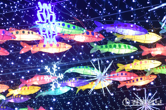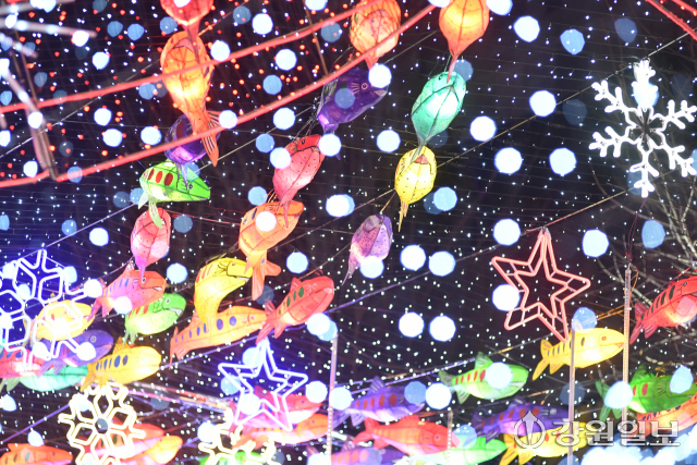화천시내 선등거리에는 지역 어르신들이 일자리 창출 차원에서 만든 수만개의 산천어등과 수백만 개의 LED 조명이 형형색색의 빛을 뿜어내고 있다.