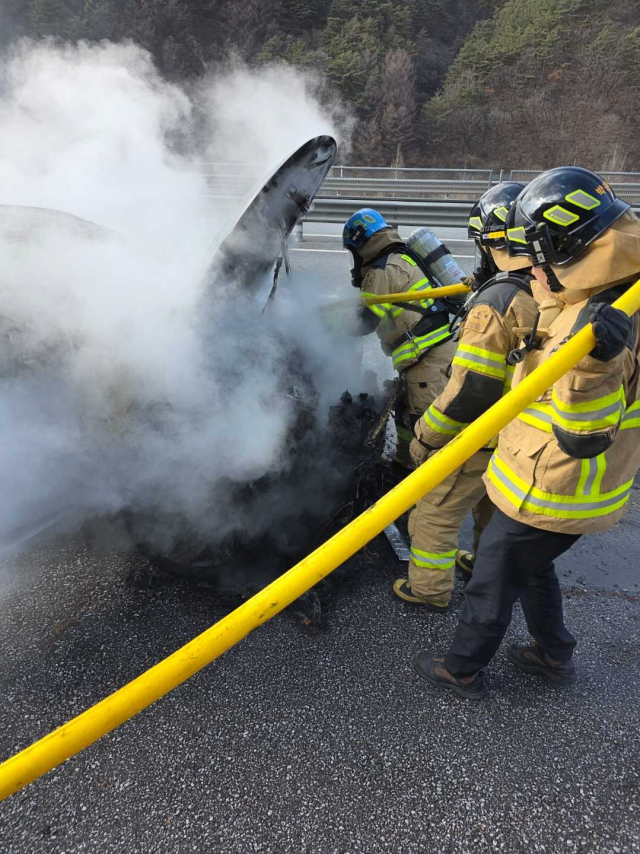 ◇25일 오후 1시12분께 정선군 신동읍 예미1교 인근에서 엔진룸 전선단락으로 추정되는 차량 화재가 발생했다. 강원도소방본부 제공.