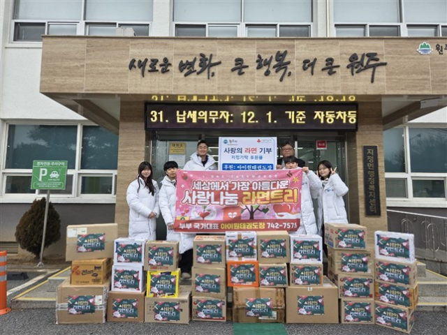 아이원태권도장(관장:염규문·황일란)은 지난 24일 원주 지정면행정복지센터에서 어려운 이웃을 돕기 위해 원생들이 십시일반 마음을 모아 준비한 라면을 전달했다.