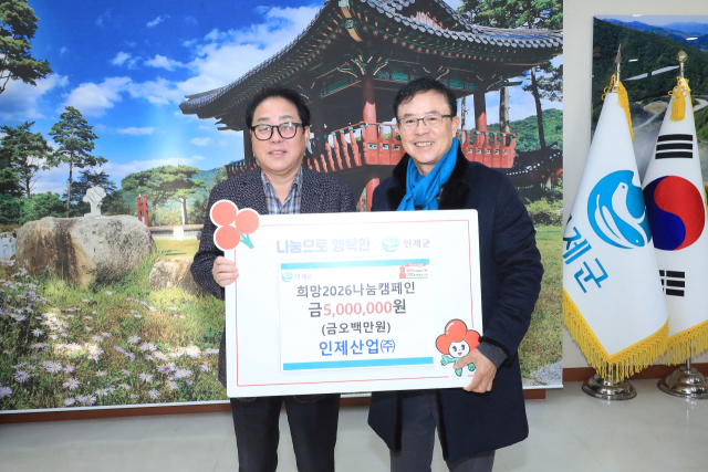또 인제산업(주)도 지역사회 기부문화 확산에 앞장섰다. 같은날 군청에서 이웃을 위해 사용해 달라며 희망 2026 나눔캠페인 성금 500만 원을 전달했다.