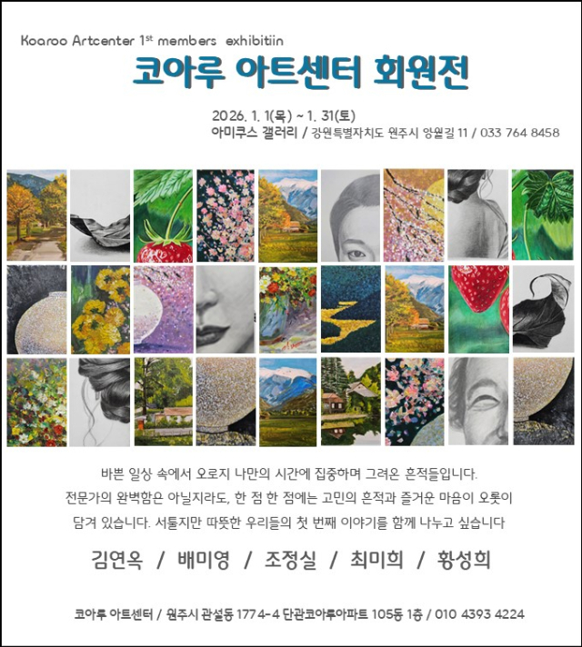 코아루아트센터 회원전이 내년 1월1일부터 31일까지 원주 아미쿠스 갤러리에서 열린다.