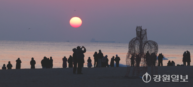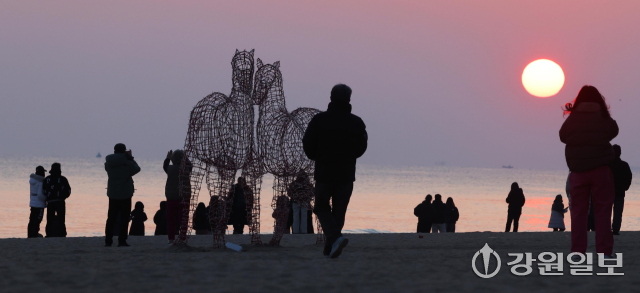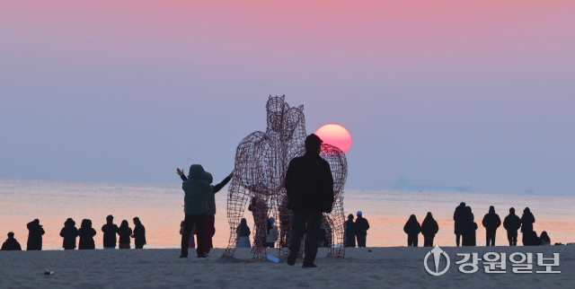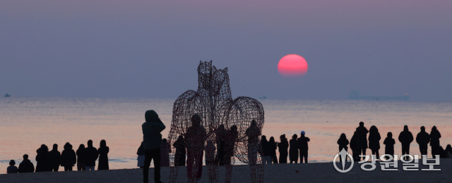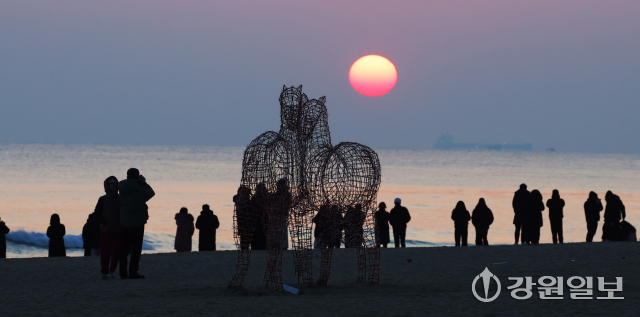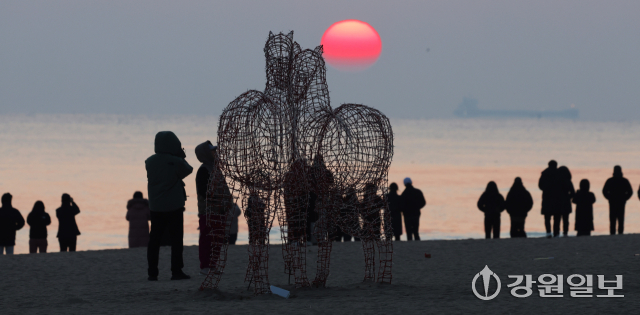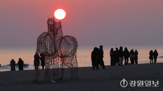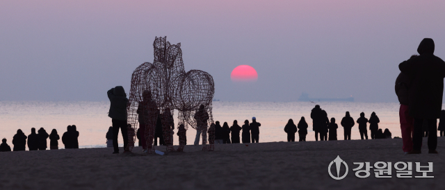 2026년 병오년(丙午年) ‘붉은 말띠’의 해를 앞두고 28일 강릉시 경포해변에 붉은말 조형물이 설치돼 관광객들이 떠오르는 해를 바라보며 추억을 남기고 있다. 강릉=권태명기자