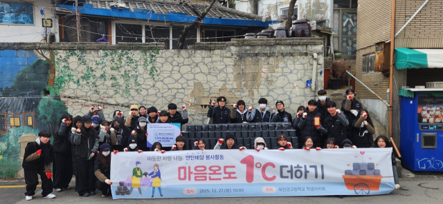 육민관고(교장:방종식)는 최근 '따듯한 사랑 나눔-연탄배달' 봉사를 통해 연탄 1,529장을 밥상공동체종합사회복지관에 기부하고 학성길 99 일대 취약계층 4가구에 연탄 1,000장을 배달했다.