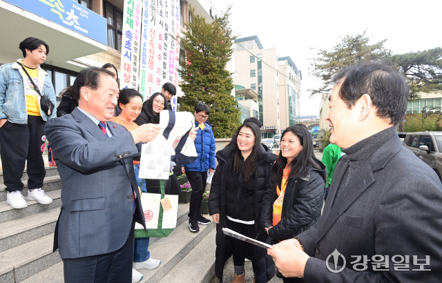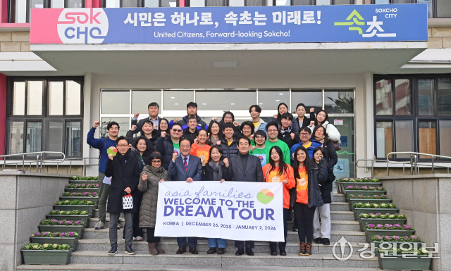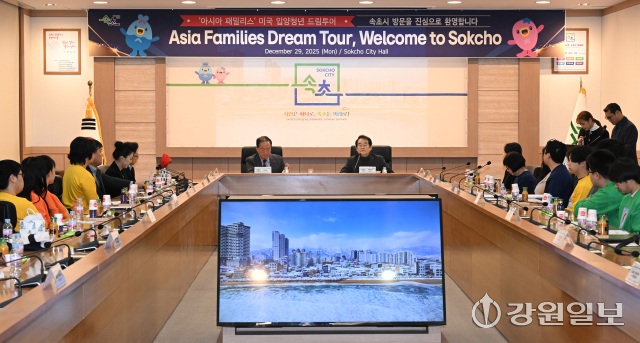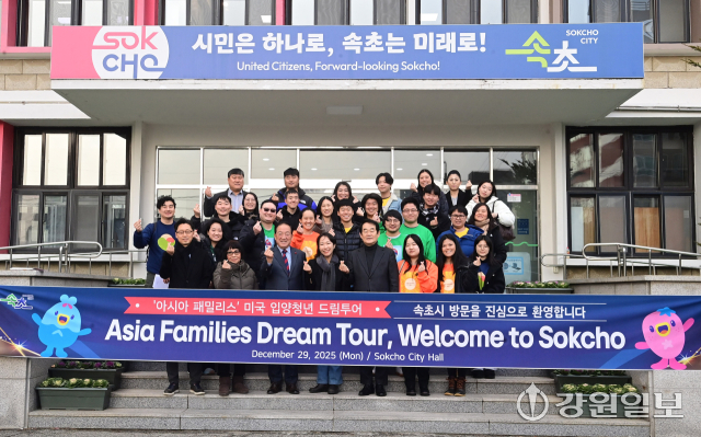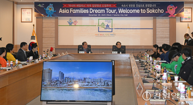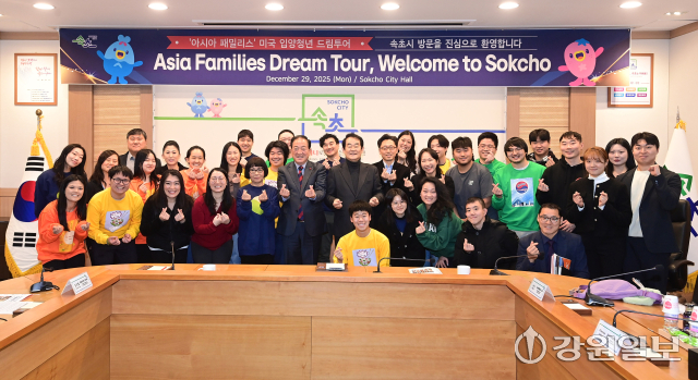 미주 한인 입양인 모국 방문 프로그램 ‘드림투어 2025’ 환영행사 29일 속초시청에서 이병선 속초시장, 박진오 강원일보 사장, 송화강 아시아 패밀리스 대표,윤진영 신세계영랑호리조트 총지배인과 방문단 27명이 참석한 가운데 열렸다. 미국에서 성장한 한국 입양 청년들은 지난 28일부터 춘천과 속초 등에서 한국문화를 체험했다. 속초=권태명기자