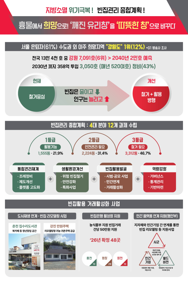 강원지역 도내 빈집은 7,091호(2024년 기준·전국 6위)로, 매년 400여동을 정비하고 있음에도 인구감소로 증가세가 계속되고 있다.