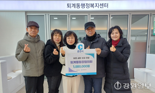 춘천 퇴계동통장협의회(부회장:김재원)는 지난해 12월31일 퇴계동행정복지센터를 찾아 불우이웃돕기 성금 100만원을 기탁했다. 이번 기부금은 사회복지공동모금회를 통해 취약계층 지원 사업에 사용된다.