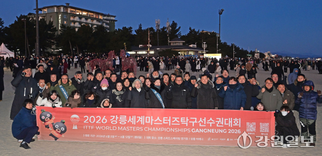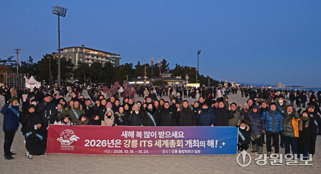 김홍규 강릉시장과 시청 직원들은 1일 강릉 경포해변에서 열린 2026년 해맞이 행사 중 6월 5~12일과 10월 19~23일 각각 열리는 세계마스터즈탁구대회, 강릉 ITS(Intelligent Transport Systems·지능형 교통체계) 세계총회의 성공개최를 염원했다. 강릉=권태명기자