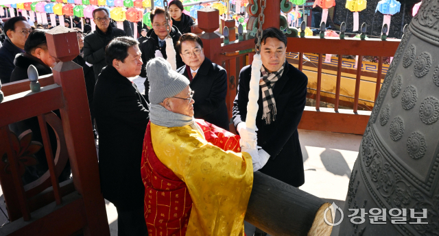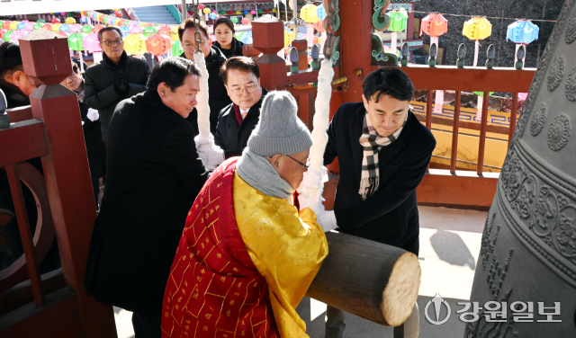 편백운 주지스님은 법어에서 “사회나 국가의 상황과 관계없이 우리는 종교인으로서 지혜인이 되어야 하고 지혜있는 사람을 추구해야 한다”며 “신심과 기도로써 가정에 평화와 행복을 가져올 수 있는 희망찬 새해가 되길 바란다”고 당부했다. 김진태 도지사는 “새해를 맞아 도민 모두가 서로를 보듬고 함께 어려움을 극복해 나가는 한 해가 되길 바란다”며 “강원특별자치도 역시 도민의 삶에 희망을 더할 수 있도록 최선을 다하겠다”고 밝혔다. 신경호 교육감은 “오늘의 타종으로 고단함과 갈등이 해소되고, 모든 도민들의 가정에 평온한 일상과 함박웃음이 가득하길 기원한다”고 말했다. 한편 범종 타종에 이어 소원성취를 발원하는 ‘법고치기’ 행사가 진행됐고, 법회에 참여한 사부대중들에게는 동안거 백일기도 당시 부처님전에 올려졌던 공양미(복덕미·福德米)와 떡국떡이 전달됐다. 또 새해맞이 떡국을 나눠 먹는 나눔행사도 이어졌다.