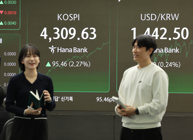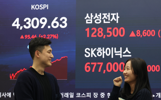 증권업계에 따르면 이날 코스피는 전장보다 95.46포인트(2.27%) 급등한 4,309.63으로 장을 마쳤다.
