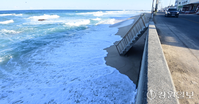 5일 찾은 강릉 하평해변. 여름철이면 6~7m 폭의 백사장에 관광객들로 북적였지만 이날은 거센 파도가 해변을 집어삼키고 있었다. 파도는 쉼 없이 밀려와 백사장을 넘어 차도 옹벽까지 들이쳤다. 순간적으로 파도가 일 때면 백사장이 모두 사라져 이곳이 해변인지 분간하기조차 어려울 정도였다. 파도에 깎여 나간 해변은 마치 바닷물이 한 겹씩 도려낸 듯한 모습이었다.