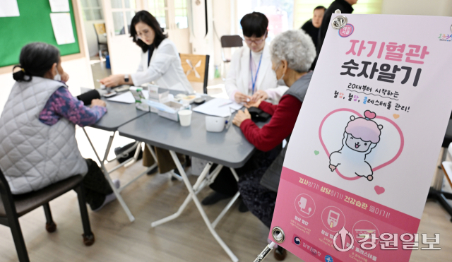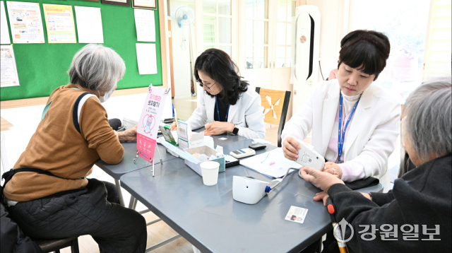 연일 강추위가 지속된 가운데 춘천시 보건소는 건강취약계층을 위한 한파대비 건강관리 교육을 실시 중이다. 5일 춘천시 우두동 우두LH 천년나무1단지 경로당에서 보건소 관계자들이 어르신의 혈압·혈당·콜레스테롤을 측정하고 한랭질환 예방을 위한 건강수칙을 교육하고 있다.