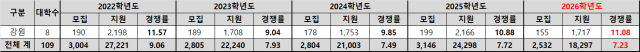 강원권 '의치한수약' 대학의 모집 인원은 2025학년도 의대정원 확대로 199명까지 증원됐다가 올해 155명으로 줄었다. 전국 109곳의 평균 경쟁률은 7.23대 1로 집계됐다. 2,532명 모집에 1만8,297명이 지원했다. 전년대비 지원인원은 6,000명이 줄었다.