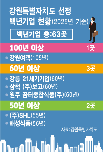 강원자치도는 지역경제 성장을 주도할 장수기업 발굴 및 육성을 위해 2012년부터 백년기업을 선정, 지난해까지 63곳을 선정했다. 이 중에서 60년 이상 기업은 강릉 21세기기업, 삼척 ㈜보고, 원주 꿈터종합식품㈜ 등 3곳이었으며, 50년 이상 운영을 이어오고 있는 기업은 원주 ㈜SHL과 속초 해성식품㈜ 등 2곳이다.