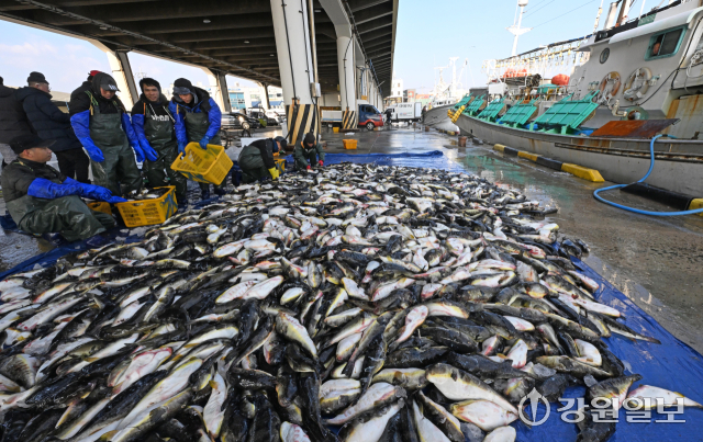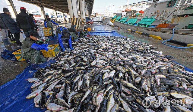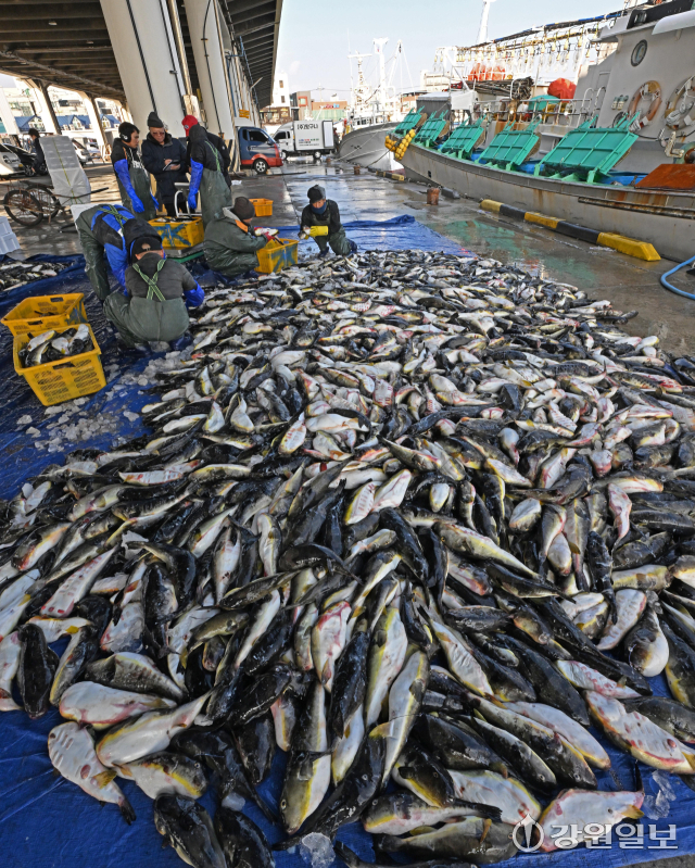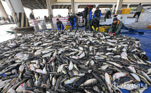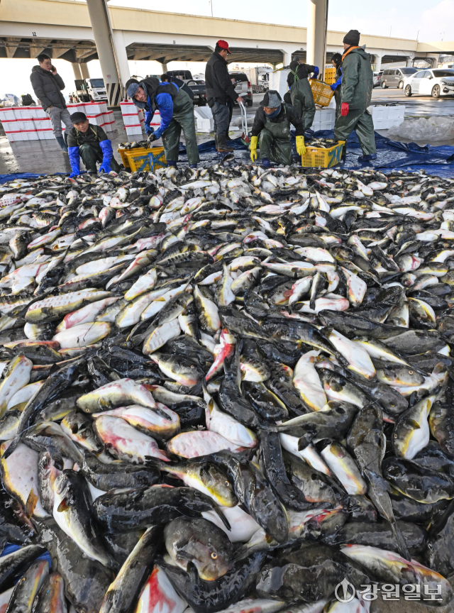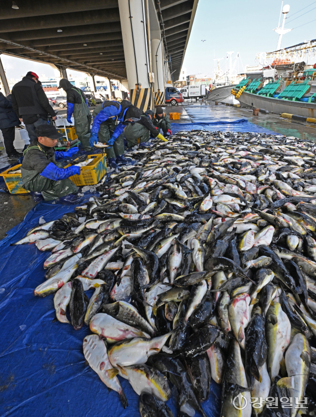 7일 강릉시 주문진항 물양장에 새해를 맞아 첫 풍어를 이룬 겨울 제철 복어가 가득하다. 강릉=권태명기자