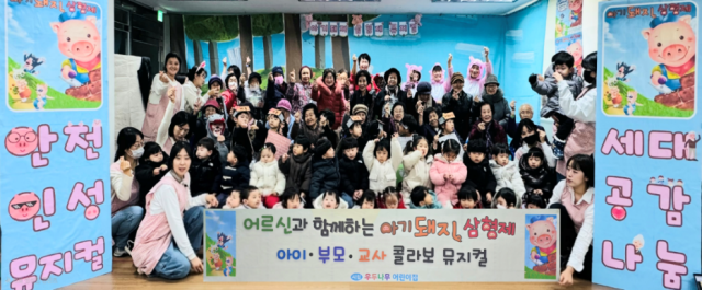 어린이집은 8일 춘천우두LH천년나무1단지 경로당 소속 어르신 25명을 초청해 그림책 뮤지컬 ‘아기돼지 삼형제’를 선보였다. 세대 공감과 지역사회 화합을 위해 마련된 이날 무대에는 5세반 아동들이 올라 공연을 펼쳤다. 특히 이번 공연의 기획과 준비, 연기에 이르는 전 과정에는 아이들 뿐만 아니라 학부모와 교사 모두가 동참하며 의미를 더했다.