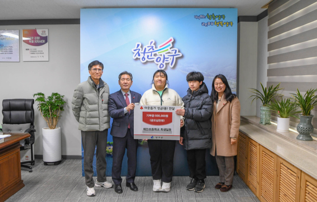 해안초교(교장:김진도) 학생 일동은 지난 9일 양구군청을 방문해 플리마켓 운영 수익금 50만원을 이웃돕기 성금으로 서흥원 양구군수에게 전달했다.