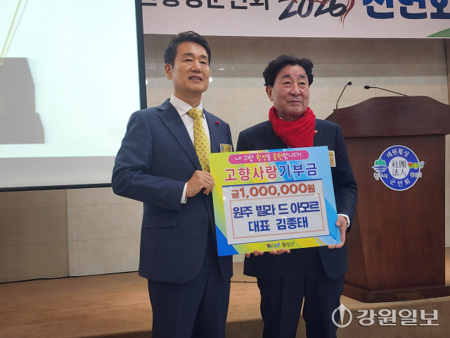 김종태 원주 빌라드 아모르 대표는 지난 9일 태장동 빌라드 아모르에서 열린 2026 재원횡성군민회 신년인사회에 참석해 김명기 횡성군수를 통해 고향사랑기부금 100만원을 횡성군에 전달했다.