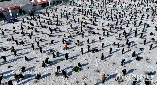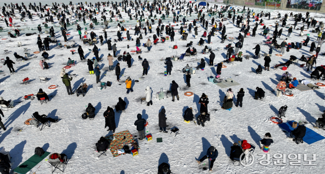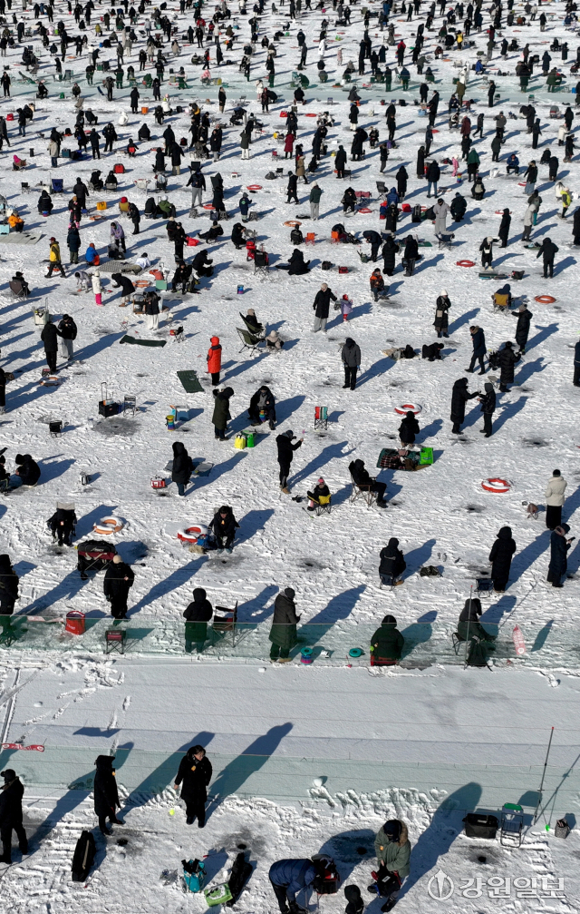 2026 화천산천어축제 개막 이틀째인 11일 축구장 30개 면적에 달하는 얼음판 위에 만들어 놓은 2만여개의 얼음구멍에는 얼음낚시를 즐기려는 관광객들이 몰려 짜릿한 손맛을 낚고 있다.