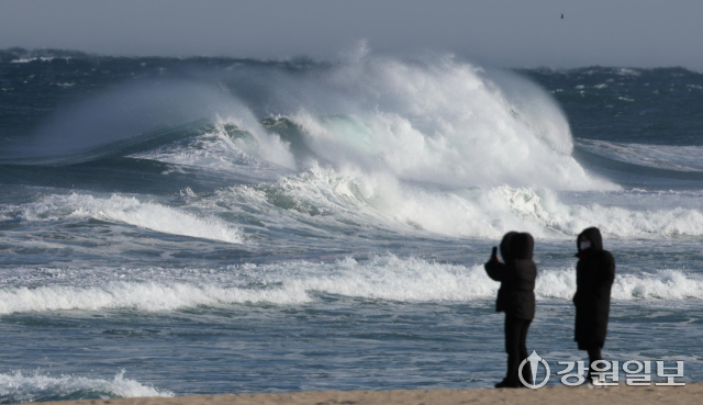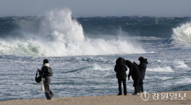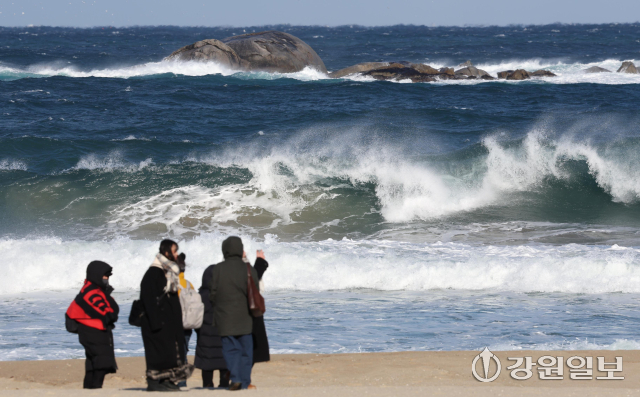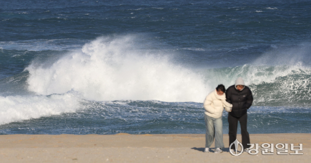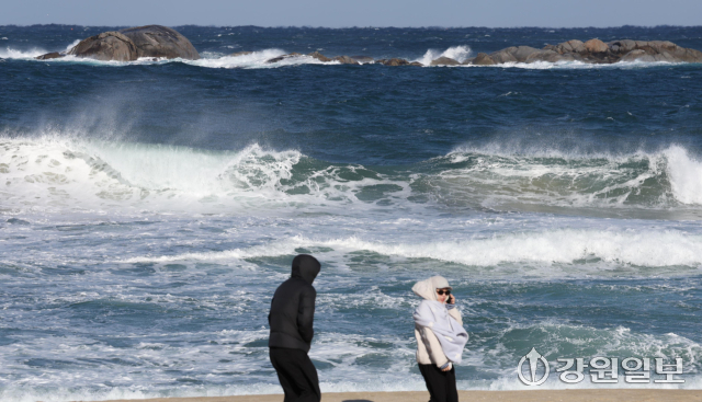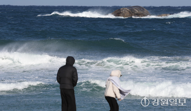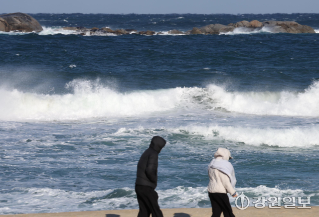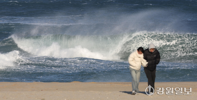 동해안에 순간풍속 70km/h(산지 90km/h)의 강한 바람과 강릉 앞바다에 최고 3.5m의 거센 파도가 일며 강풍·풍랑특보가 내려진 11일 강릉 경포해변을 찾은 관광객들이 추위와 바람에 잔뜩 움츠려 있다. 강릉=권태명기자