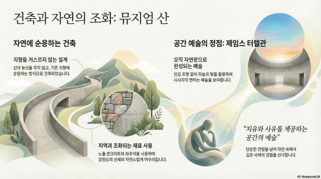 원주 오크밸리 산자락에 위치한 ‘뮤지엄 산’은 전시된 그림보다 건축물 자체가 하나의 거대한 예술품이다. 건축계의 노벨상인 프리츠커상을 수상한 안도 다다오는 산의 능선을 깎지 않고 지형에 순응하는 방식을 택했다. 회색 노출 콘크리트로 대표되는 그의 건축 언어에 경기도 파주에서 가져온 붉은색 ‘파주석’을 외벽으로 둘러 강원도의 산세와 이질감 없이 녹아들게 했다. 특히 제임스 터렐관은 이 장소성의 정점을 찍는다. 인공 조명을 배제하고 오직 강원도의 하늘과 자연광만을 활용해 시시각각 변하는 빛의 향연을 보여주는 ‘스카이 스페이스’는 이곳이 아니면 구현 불가능한 예술이다. 이는 단순한 관람을 넘어 자연 속에서의 치유와 사유를 제공하는 ‘공간의 예술’이다.
