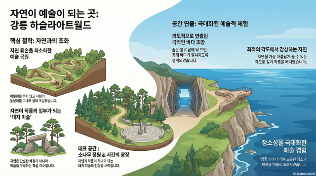 원주가 산과 건축의 조화라면, 강릉 ‘하슬라아트월드’는 바다와 대지 미술(Land Art)의 결합이다. 조각가 부부인 최옥영, 박신정은 강릉시 강동면 해안 절벽의 비탈면을 깎지 않고 지형의 높낮이를 그대로 살려 10만9,000㎡의 예술 정원을 일궈냈다. 이곳의 핵심은 자연 훼손을 최소화하면서 자연을 가장 아름답게 볼 수 있는 각도로 길을 내고 작품을 배치했다는 점이다. 관람객이 미술관 터널을 통과하거나 좁은 통로를 지나면 갑자기 탁 트인 동해 바다가 펼쳐지는 구조는 의도된 연출이다. 야외 조각공원의 ‘소나무 정원’과 ‘시간의 광장’은 작품이 자연을 배경으로 서 있는 것이 아니라, 자연이 곧 작품의 일부가 되는 대지 미술의 전형을 보여준다. 이는 강릉의 바다라는 장소성을 예술적 체험으로 극대화한 사례다.