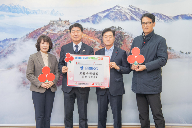 고성군체육회(회장:곽상규)는 12일 고성군청 군수 집무실에서 사랑의 성품 쌀 880㎏을 함명준 군수에게 기탁했다.