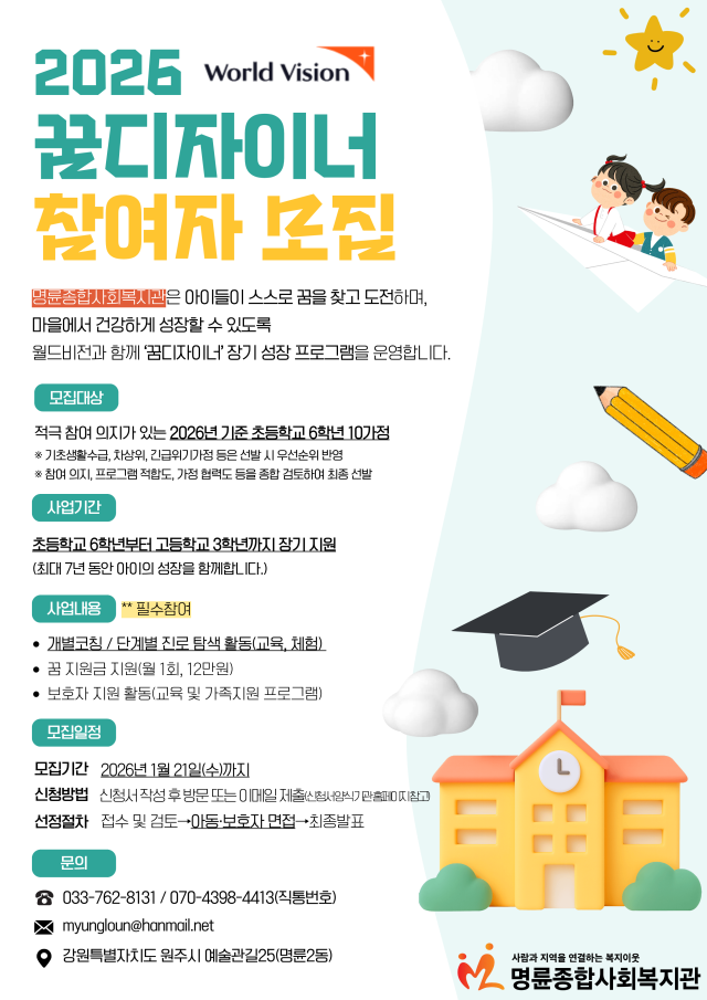 【원주】명륜종합사회복지관이 오는 21일까지 월드비전과 연계해 2026년 ‘꿈디자이너’ 사업에 참여할 아동을 모집한다.