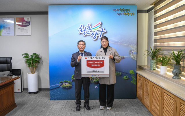 (주)아성(대표:이은정)은 13일 양구군청을 방문해 이웃돕기 성금 200만원을 서흥원 양구군수에게 전달했다.