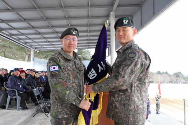 양구 제21보병사단장 취임식이 14일 부대에서 열려 이상렬 3군단장(사진 왼쪽)이 윤기선 사단장에게 부대기를 전달하고 있다.