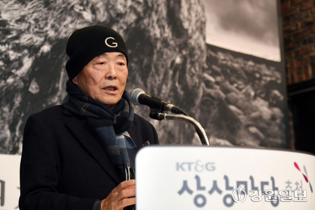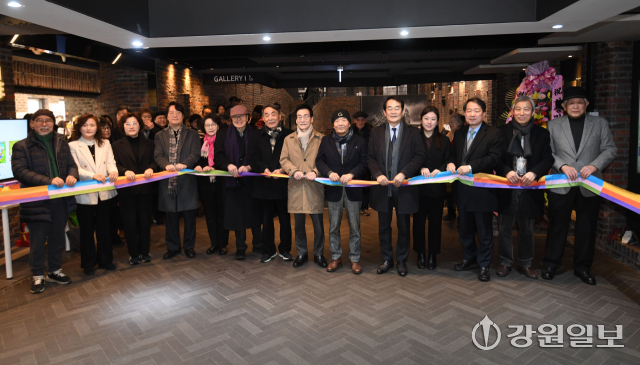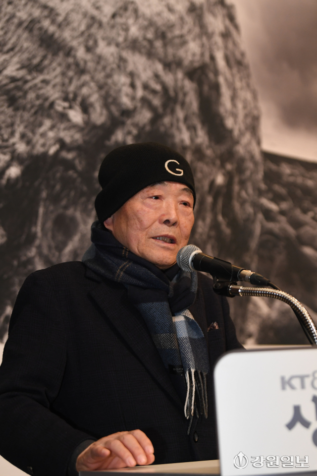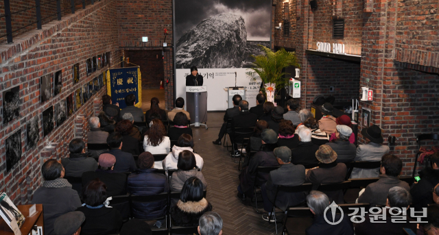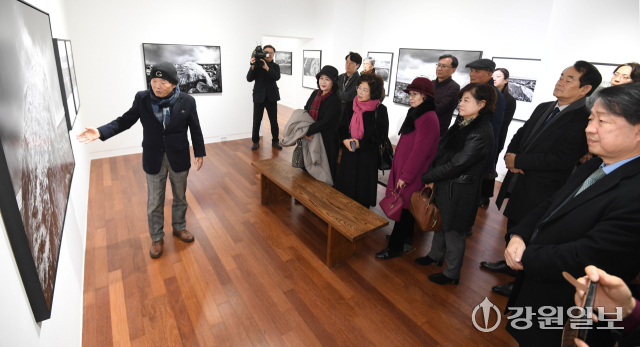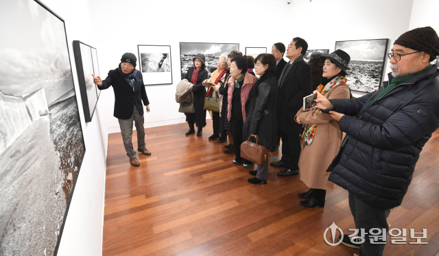 심상만 사진가의 ‘풍화된 기억 (Weathered Memory)’ 사진전 개막식이 14일 KT&G 상상마당 춘천에서 열렸다. 박진오 강원일보사장을 비롯한 참석 내빈들이 심상만 작가의 설명을 들으며 작품을 감상하고 있다. 영국 브라이튼 인근의 ‘세븐시스터즈(Seven Sisters)’ 해안의 풍화된 바위의 모습 등을 흑백사진으로 담은 이번 전시는 이달 28일까지 열린다. 박승선기자