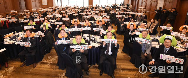2026 강원자치도 문화예술인신년교례회 및 강원일보 신춘문예 시상식이 14일 춘천 베어스호텔에서 김진태 도지사, 김시성 도의장, 신경호 도교육감, 허영 국회의원, 박진오 강원일보사장, 이재한 강원예총회장, 최찬호 강원민예총이사장, 최현석 강원경찰청장, 최성현 강원관광재단 대표이사 등 기관 단체장과 수상자, 도내 문화예술인들이 참석한 가운데 열렸다.