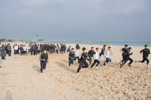 국가대표를 포함한 전국 태권도 선수 450여명이 다음 달 14일까지 고성 지역에서 동계 전지훈련을 진행하는 가운데 15일 죽왕면 삼포해수욕장에서 선수들이 훈련하고 있다. 한편 고성군은 올해 120여개 스포츠 팀 2,000여명의 동계 전지훈련단을 유치했다.