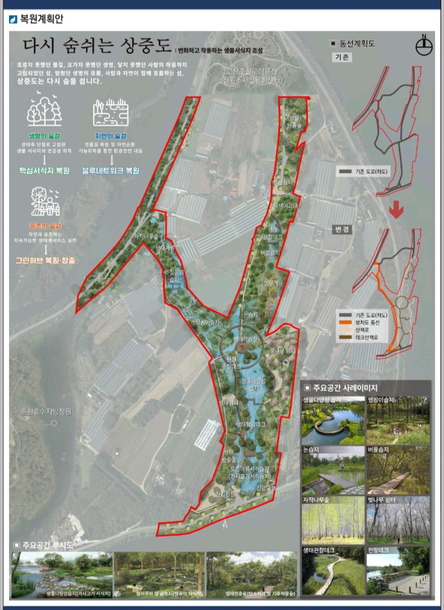 춘천시는 올 상반기까지 상중도 도시생태축 복원 사업 설계 용역을 추진, 15일 주민들을 대상으로 설명회를 열었다. 상중도 도시생태축 복원은 단절·손상된 생태계를 되살리는 사업으로 중도동 114번지 일원 17만㎡를 녹지와 습지로 가꿀 계획이다. 사업 대상지는 불법 낚시로 인한 수질 오염과 생태 교란이 지속적으로 발생하던 곳이다. 시는 이번 설명회에서 모아진 주민 의견을 토대로 공간 구성의 완성도를 높인다.