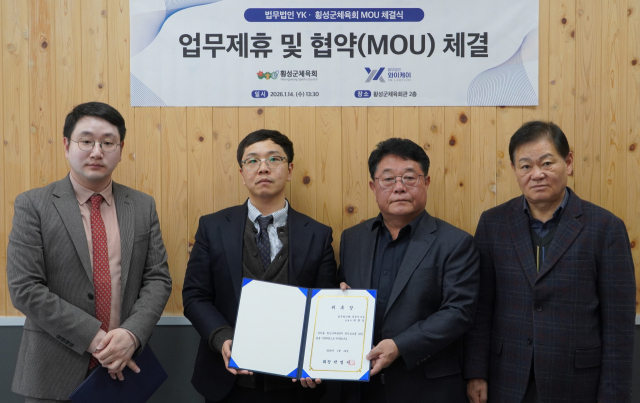 【횡성】횡성군체육회(회장:박명서)는 14일 법무법인YK 춘천지사(지사장:박훈석)와 체육행정의 전문성 강화 및 법률지원체계 구축을 위한 업무협력 양해각서(MOU)를 체결했다.