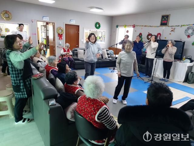 길연하(67) 하모니스트가 지도하는 콰트로팀이 이날 연주를 시작하자 이곳에서 생활하는 16명의 어르신들은 어깨춤을 덩실덩실 추는 등 웃음꽃을 피웠다.
