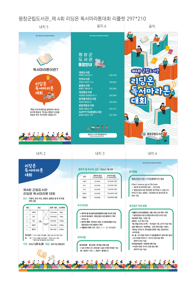 【평창】평창군은 책 읽는 문화 조성을 위해 오는 20일부터 6월 30일까지 평창군민을 대상으로 제4회 독서마라톤 대회를 운영한다.
