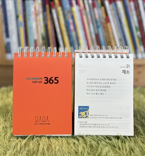 센터가 제작한 만년 일력은 2015년부터 2024년까지 최근 10년간 발간된 우리나라 그림책 4,999권의 제목을 분석해 선정한 낱말과 그림책을 하루에 하나씩 소개하는 형식으로 구성됐다.