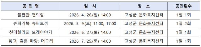 진행 예정 공연으로는 연극 ‘불편한 편의점’과 ‘붉고, 깊은 파랑: 머구리’, 뮤지컬 ‘슈퍼거북 슈퍼토끼’, 오페라 ‘신데렐라의 모래이야기’ 등 총 4개 작품이 있다. 모든 공연은 고성군 문화복지센터에서 볼 수 있으며 오는 4월부터 7월까지 매월 1편씩 총 4편의 공연이 순차적으로 진행될 예정이다. 군은 이 같은 공연을 매월 마지막 주말 ‘문화가 있는 날’에 진행해 주민들이 정기적으로 공연예술을 즐길 수 있도록 할 방침이다.
