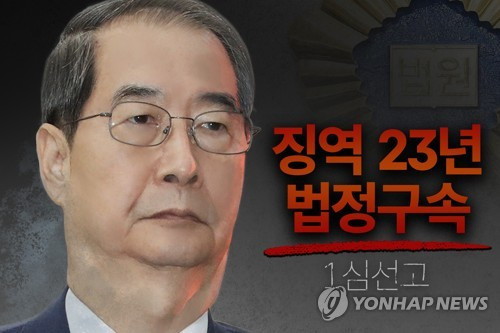 서울중앙지법 형사합의33부(부장판사 이진관)는 21일 한 전 총리에게 징역 23년을 선고하며, 증거인멸 우려를 이유로 즉각 법정 구속했다.