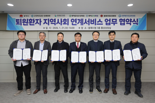 퇴원환자 지역사회 연계 서비스 업무협약식이 21일 동해시(시장:심규언), 근로복지공단 동해병원(원장:김홍주), (의)동해동인병원(원장:이상윤), 동해요양병원(원장:이재웅), 동해금강요양병원(원장:김헌대), 동해이레요양병원(원장:최명섭), 삼척의료원(원장:권오선) 등이 참가한 가운데 동해시청 통상상담실에서 열렸다.