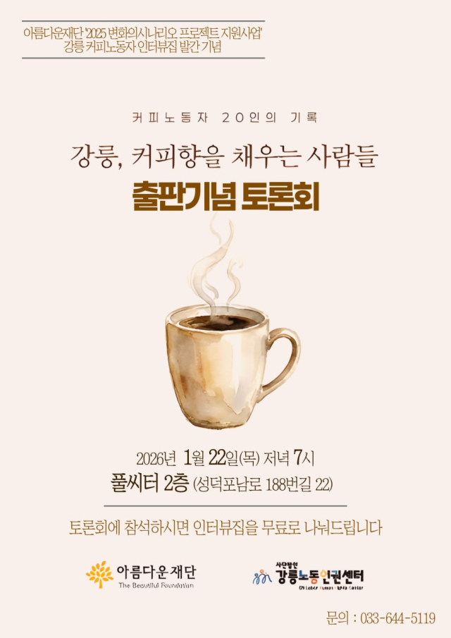 이번에 출판되는 책은 강릉노동인권센터가 지난해 강릉의 커피노동자들의 노동환경을 인터뷰한 내용을 펴낸 인터뷰집이다. 이번 토론회에서는 강릉 커피산업의 노동환경을 돌아보고 현장노동자의 이야기를 들어보는 시간을 가질 예정이다. 토론회 참석자들에게는 인터뷰집을 무료로 나눠줄 예정이며, 자세한 사항은 강릉노동인권센터((033)644-5119)로 문의하면 된다.