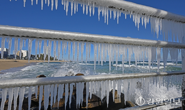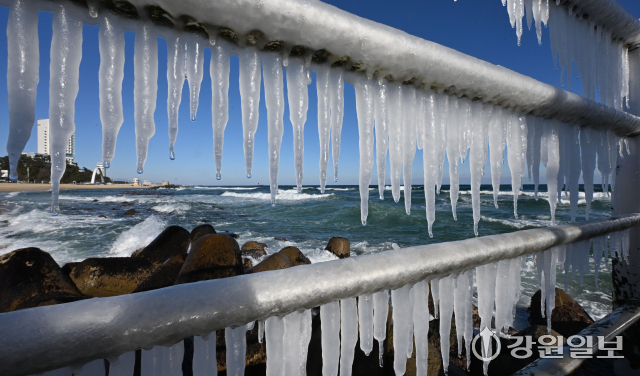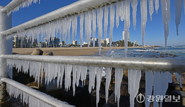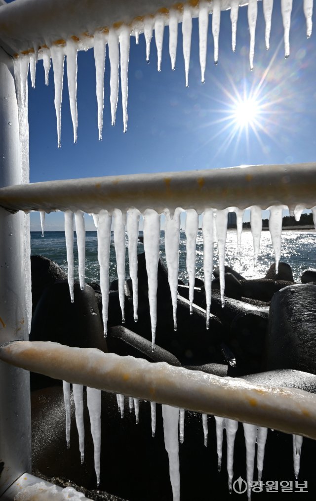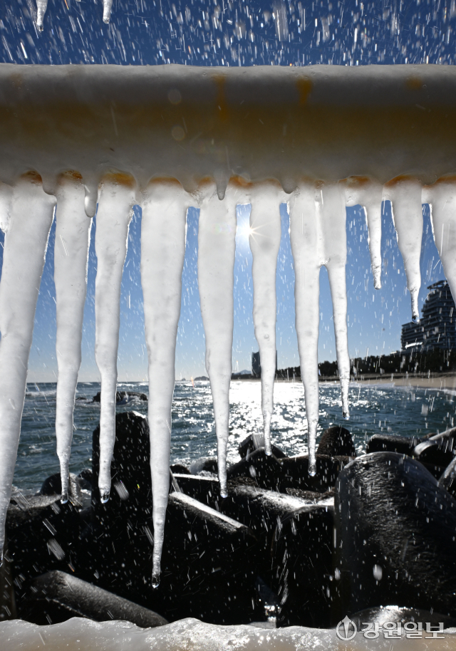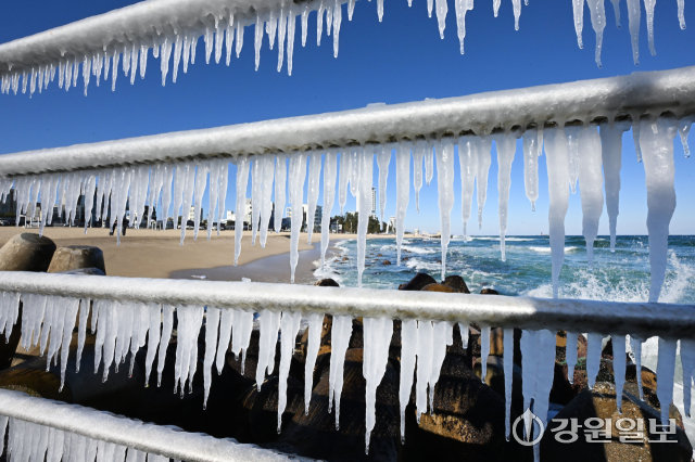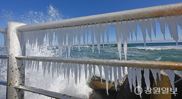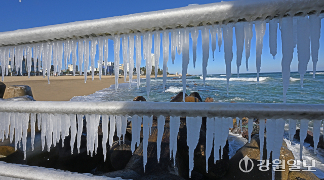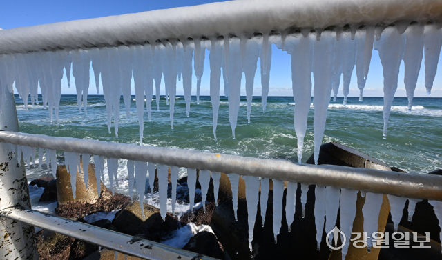 전국 대부분 지역에 한파특보가 발효된 21일 강릉의 한 해변 방파제 난간에 바닷물이 얼어붙어 고드름이 생겨나 추위를 실감케 한다. 강릉=권태명기자
