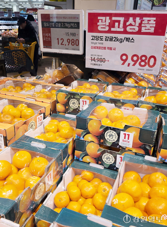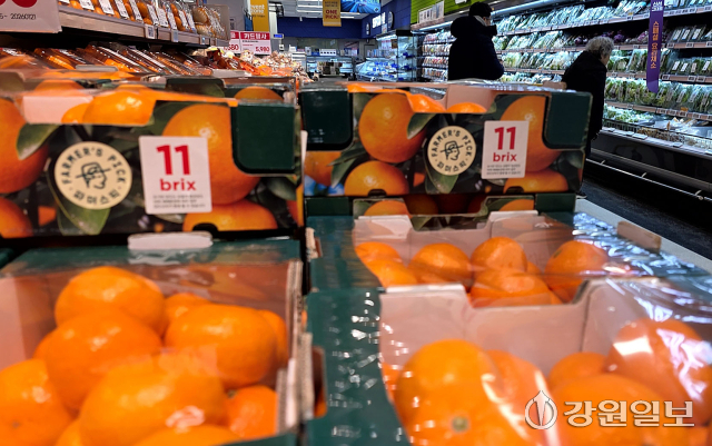 생산자 물가가 4개월 연속 오름세다. 한국은행에 따르면, 12월 생산자물가지수는 11월(121.31)보다 0.4% 높은 121.76(2020년 수준100)으로 집계됐다. 특히 감귤은 제철 과일임에도 불구하고 12.9% 급등했다. 사진은 21일 도내 대형마트에서 감귤 매대. 신세희기자생산자 물가가 4개월 연속 오름세다. 한국은행에 따르면, 12월 생산자물가지수는 11월(121.31)보다 0.4% 높은 121.76(2020년 수준100)으로 집계됐다. 특히 감귤은 제철 과일임에도 불구하고 12.9% 급등했다. 사진은 21일 도내 대형마트에서 감귤 매대. 신세희기자생산자 물가가 4개월 연속 오름세다. 한국은행에 따르면, 12월 생산자물가지수는 11월(121.31)보다 0.4% 높은 121.76(2020년 수준100)으로 집계됐다. 특히 감귤은 제철 과일임에도 불구하고 12.9% 급등했다. 사진은 21일 도내 대형마트에서 감귤 매대. 신세희기자