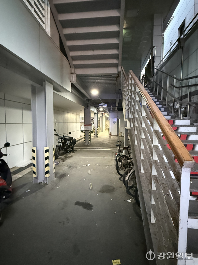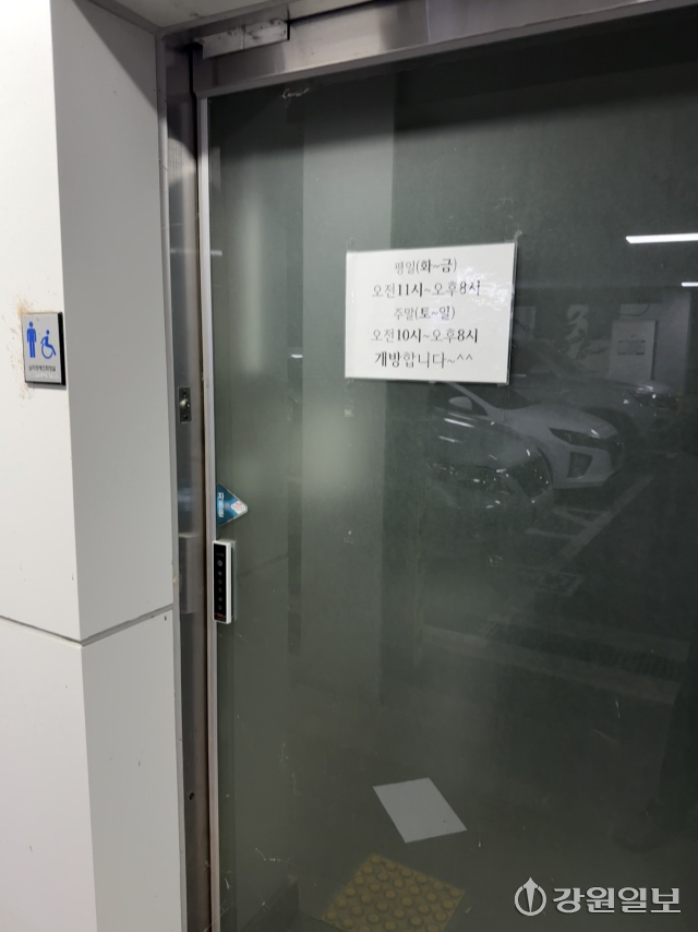 22일 찾은 양구읍 차 없는 거리에 위치한 열린문화쉼터 내 VR 게임장. 출입문은 굳게 잠겨 있었고, 유리문 한켠에는 ‘게임장 내부 시설 정비로 인해 잠정 운영 중단합니다’라는 안내문이 붙어 있었다. 건물 바닥에는 담배꽁초 등 쓰레기가 여기저기 널려 있어, 관리의 손길이 닿지 않은 듯한 모습이 역력했다. 쉼터 내 화장실은 오후 8시까지 개방한다고 돼 있었지만, 이날 오후 3시께 문은 잠겨 있었다.