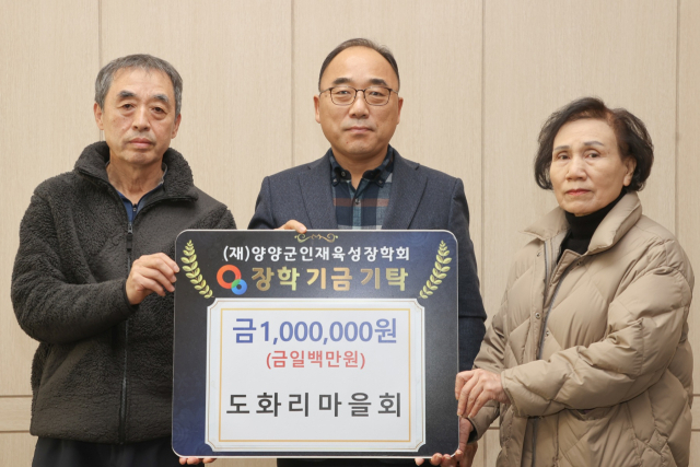 도화리마을회(이장:이대형)은 22일 양양군청을 방문해 탁동수 양양군수권한대행에게 인재육성장학기금 100만원을 전달했다.