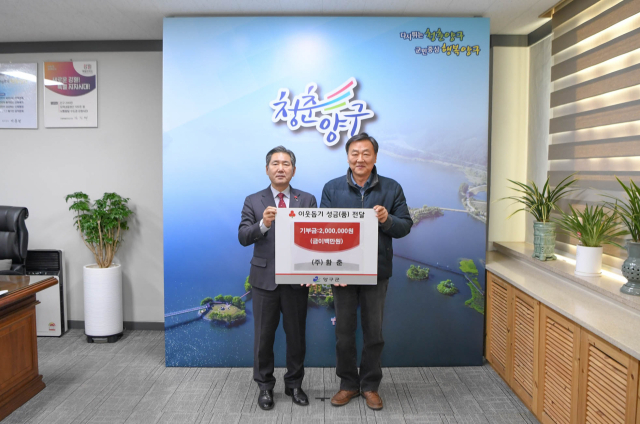 (주)함춘(대표:이훈식)은 지난 23일 양구군청을 방문해 이웃돕기 성금 200만원을 서흥원 양구군수에게 전달했다.