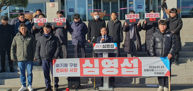 심영섭 전 강원경제자유구역청장이 23일 강릉시청 앞에서 기자회견을 열고 6·3 지방선거에서 강릉시장 출마를 공식 선언했다.
