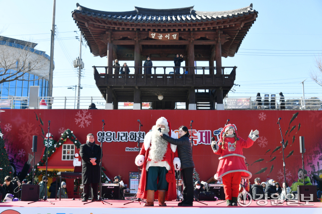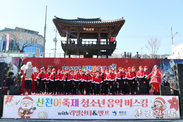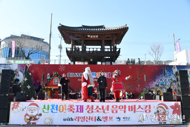 화천산천어축제장에서 24일 화천지역 청소년들과 핀란드 리얼산타가 버스킹 공연을 진행해 관광객들의 관심을 끌었다.
