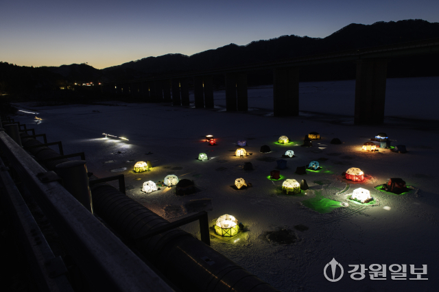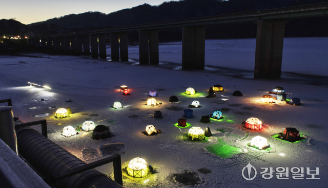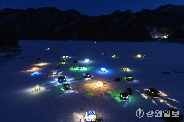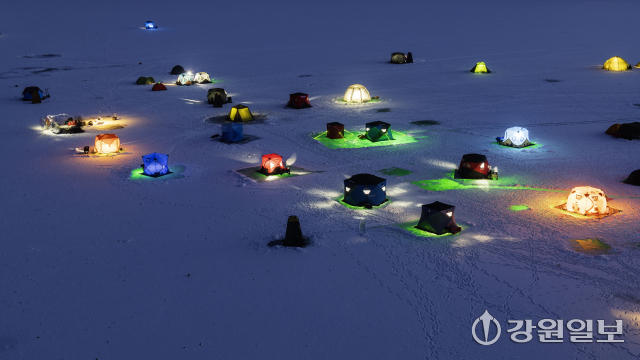 인제대교 부근에는 빙어낚시에 열정인 강태공들로 가득하다. 땅거미가 진 밤에도 강태공들의 열정은 호수위에 불꽃으로 가득하다.