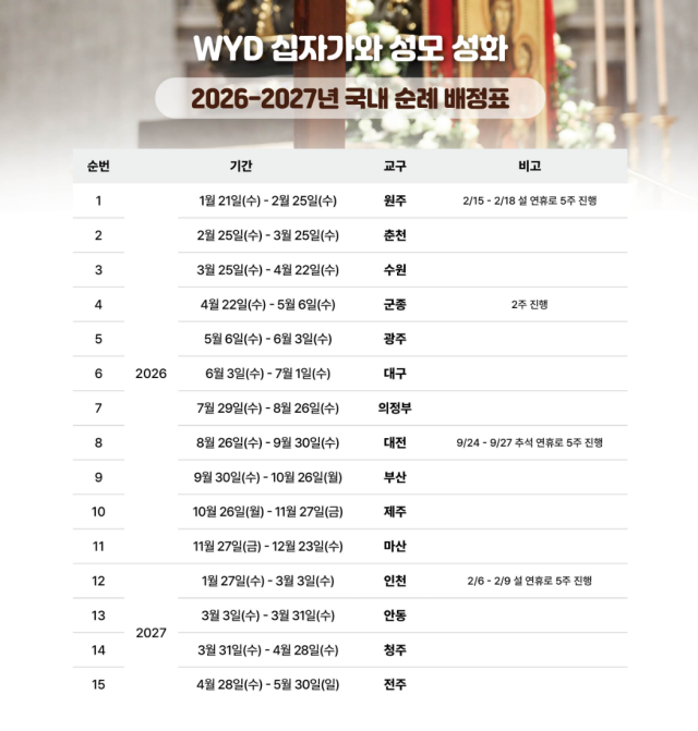 26일 한국천주교주교회의에 따르면 WYD 십자가와 성모 성화는 다음달 25일까지 원주에 머문다. 이후 3월 25일까지 한 달간 춘천교구에 머무를 예정이다. 강원을 시작으로 전국 15개 교구를 순례하는 WYD 십자가와 성모 성화의 여정은 2027년 5월 30일 전주교구에서 마무리된다.